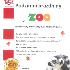 Čeká na Vás přespávačka s program a v sobotu výlet do Kroměříže - zábavné centrum Dětský svět. Výlet bude i s obědem. Podrobné informace Vám budou zaslány v propozicích. Na všechny se těší Jarka, Anet a Barča
