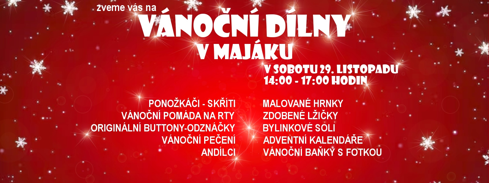 Vánoční dílny pro děti a dospělé: baňky s fotkou, perníky a sušenky, ozdoby z moosgummi, dárkové vánoční krabičky, originální buttonky a zrcátka, ponožkoví plyšáci, malované tašky a polštáře, balzámy na rty,... + vánoční trhy a vystoupení kroužků. Není potřeba se předem přihlašovat. Stačí si jen vybrat, kterou dílnu navštívíte. Spolufinancováno městem Vyškov.