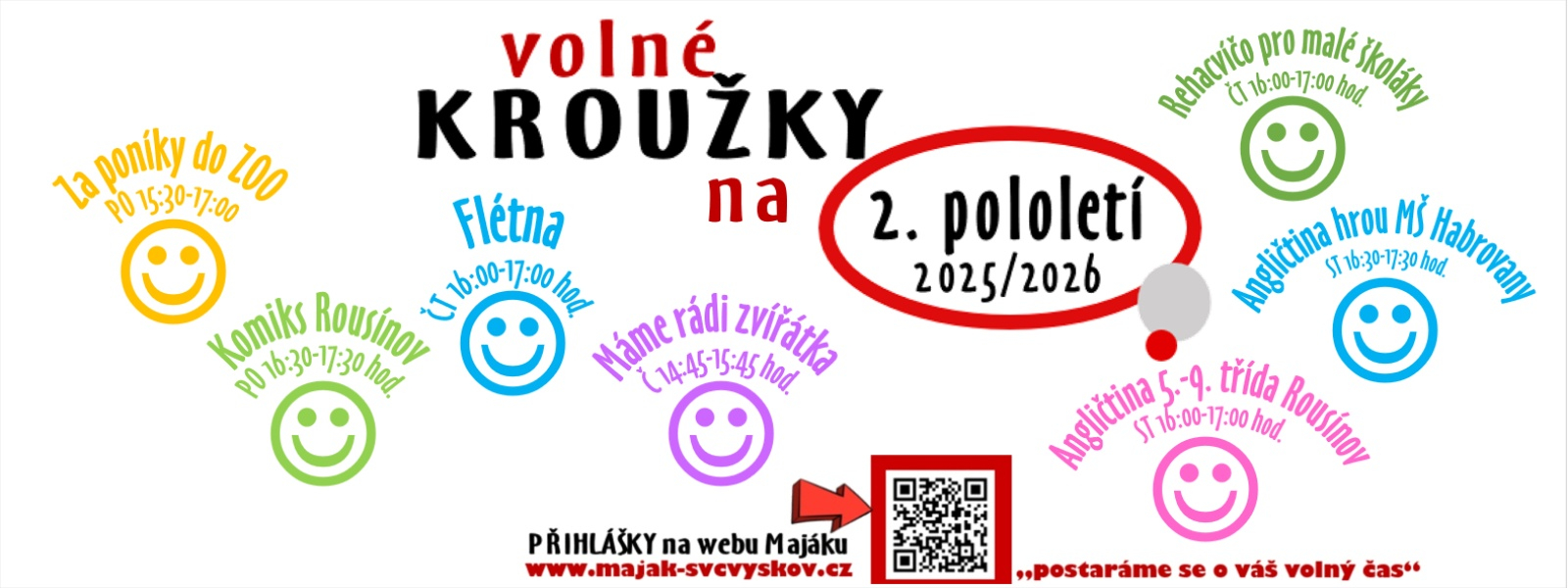 V pátek 30. ledna 2026 jsou pololetní prázdniny a schůzky kroužků se nekonají.
